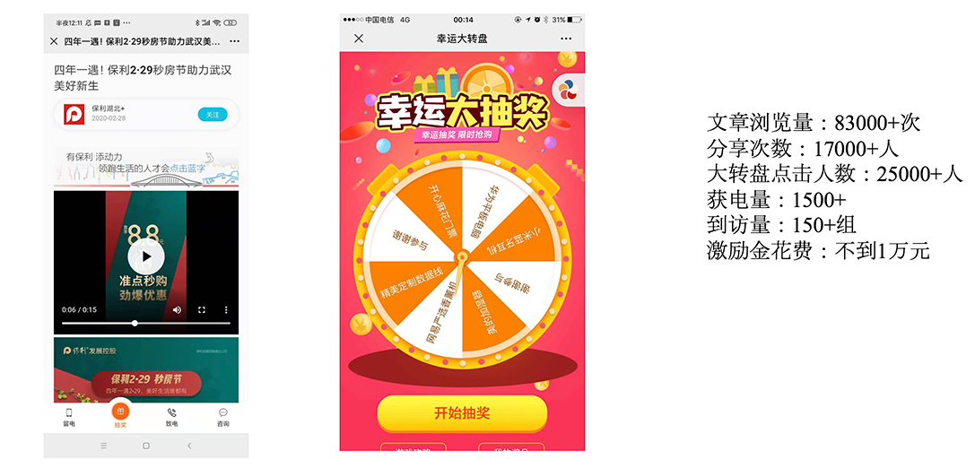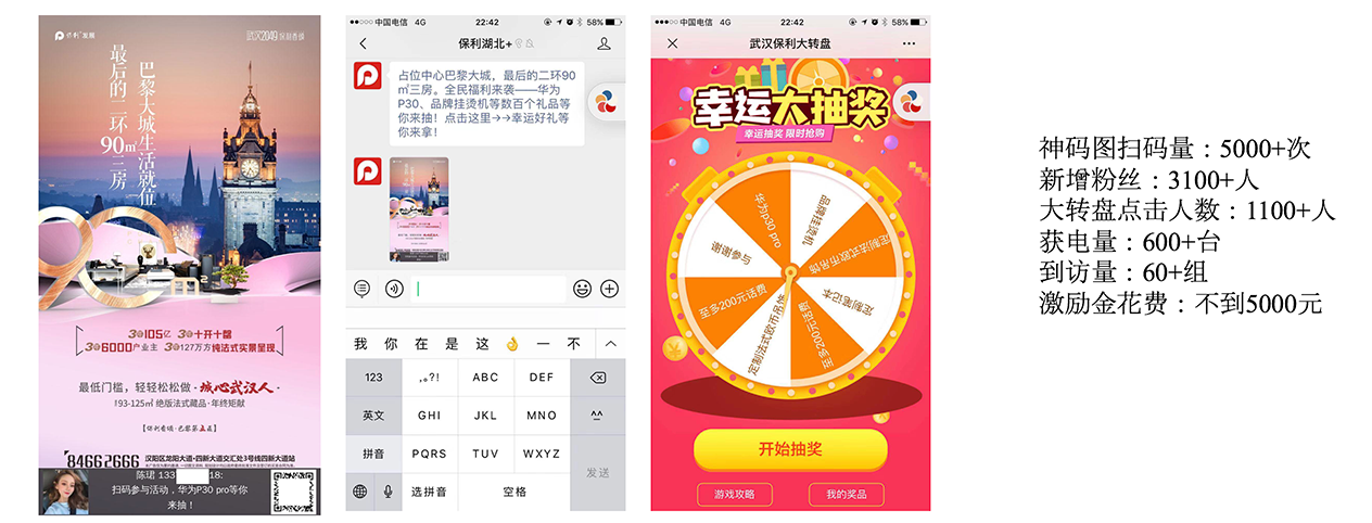 武汉保利通过如释云AI营销获客系统,打出内容社交营销+大转盘抽奖的组合拳,实现了节点信息迅速扩散,客户转到访的比例也得到了大幅提升。经过AI营销云获客系统赋能的11次内容传播,带来了累计浏览量17W,分享量2.5W,获电近3000组,带来150+组客户到访案场,其中8组是高意向购房客户。