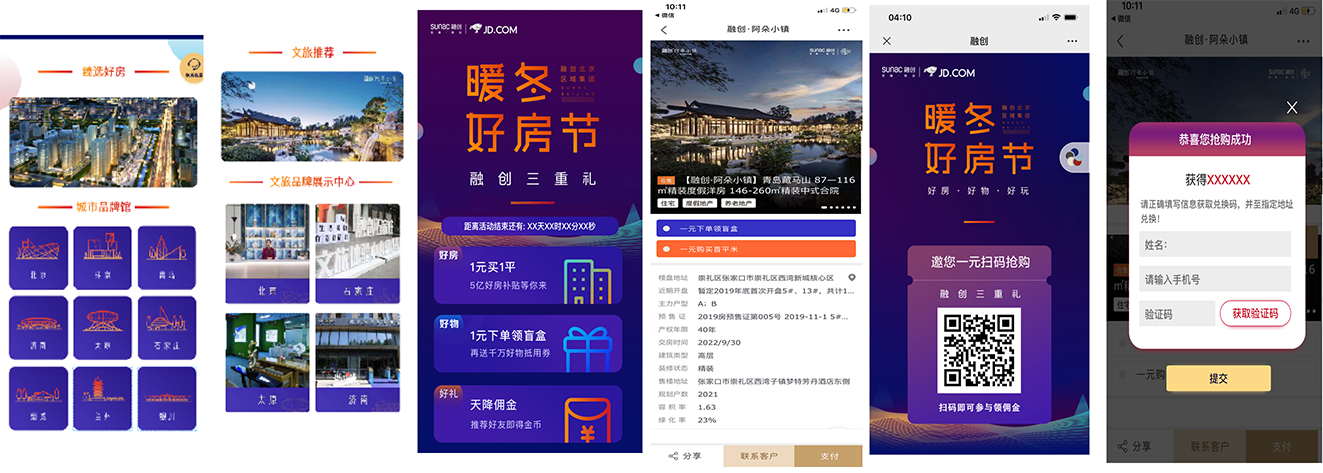 融创北京品牌部跟京东合作,在北京、环京、青岛、济南、太原、石家庄、烟威、兰州、银川九大区域进行了一场大型区域联动活动:“暖冬好房节” ,但京东只能在app和pc端传播,没有办法在朋友圈进行私域流量社交营销传播,如释科技帮助融创对该活动主题进行二次创策,策划首平米一元购和一元购盲盒活动,区域内52个项目联合参加!
