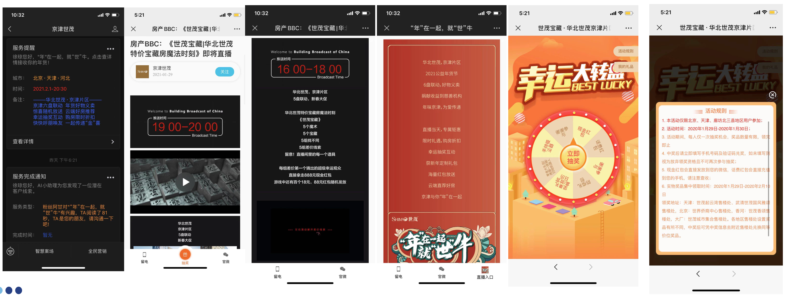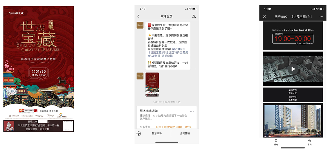 年关将至,正是各项目密集发声的时间点,华北世茂京津片区急需在饱和的市场发声中寻求突破口。在2021年春节期间,华北世茂京津片区联动,打出海报+图文+抽奖组合活动释放直播活动信息。短短的三天宣传期,带来2.4W浏览量,覆盖近1W名用户,活动信息被分享超5000次,公众号增粉3K+,目标区域内留电近500组,并为直播引流2W+用户。
