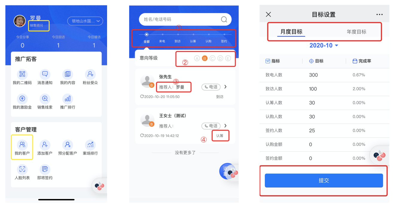 益田项目设置接待岗,专人进行判客录客,并将合作渠道公司统一线上注册使用,让渠道人员也能轻松实现线上推荐客户,置业顾问在移动端也能每天,轻松便捷的更新客户信息。