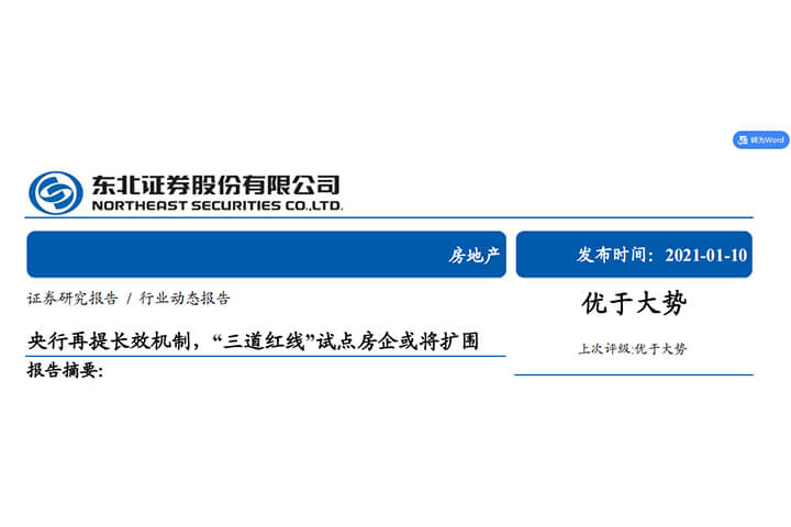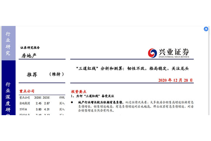 “三道红线”备受关注;对行业总量影响:负债、拿地、销售、投资;对行业格局的影响;三道红线下,各个渠道配套监管。